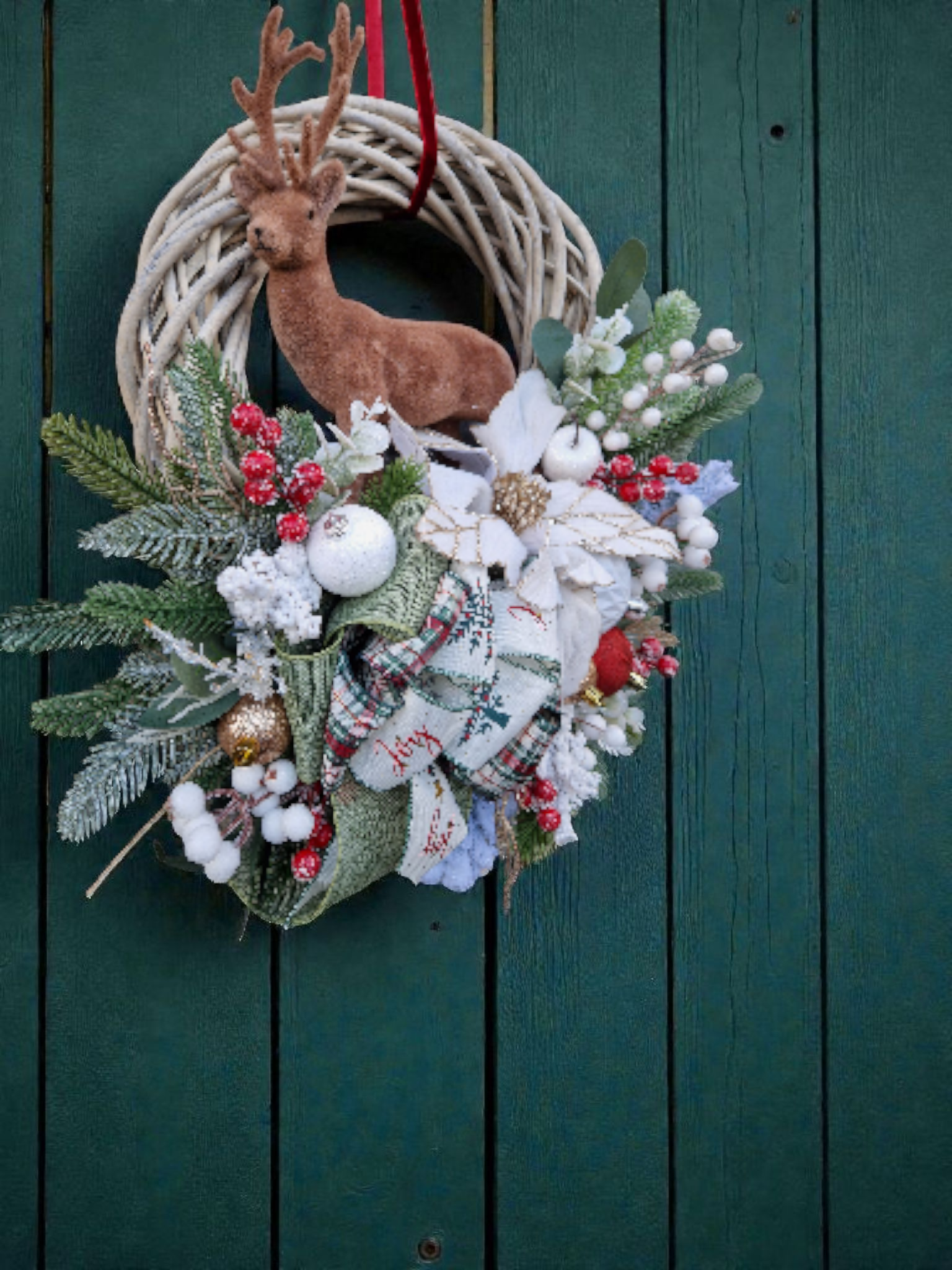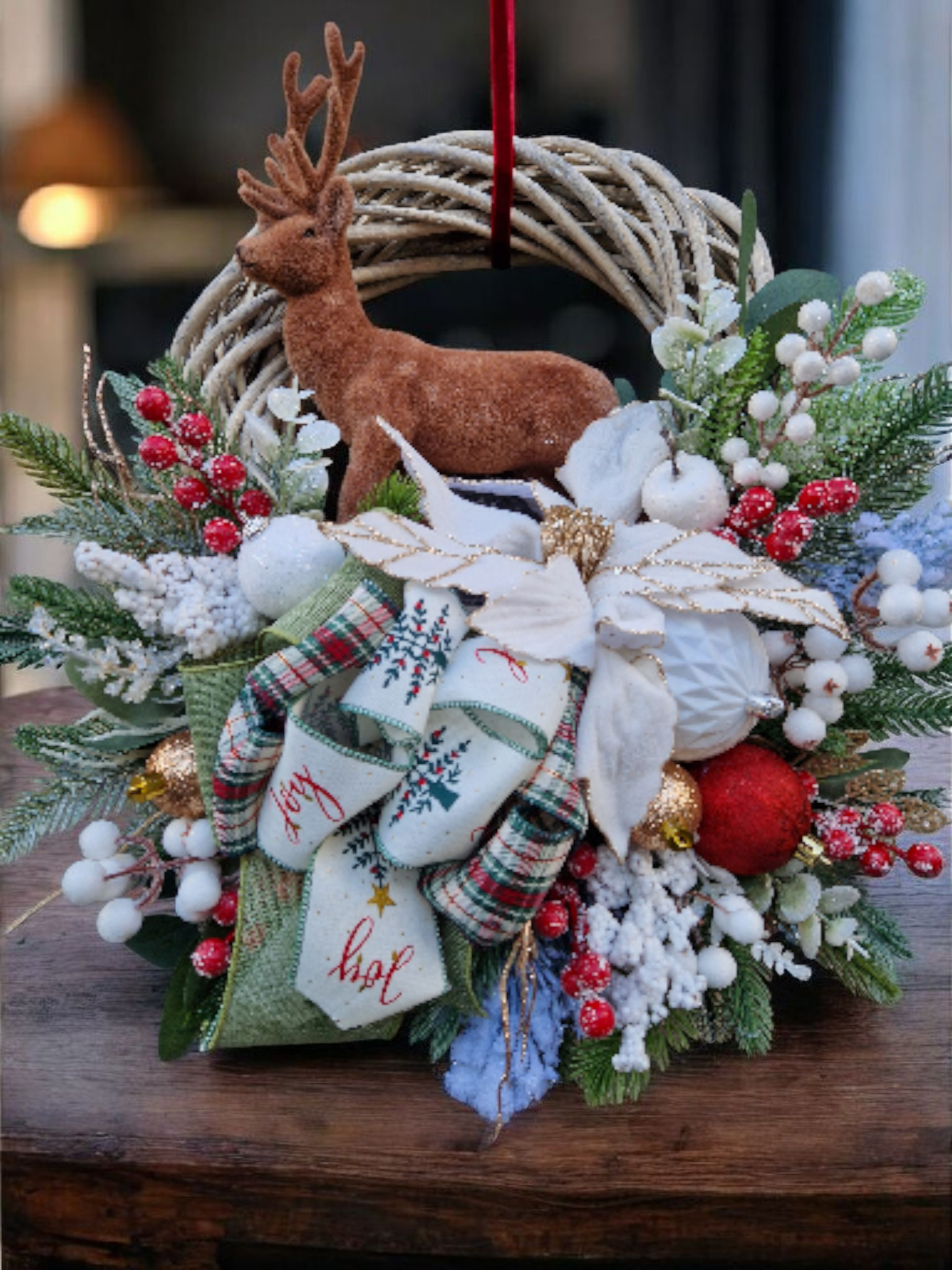 A very realistic-looking reindeer is placed in the center of the wreath.