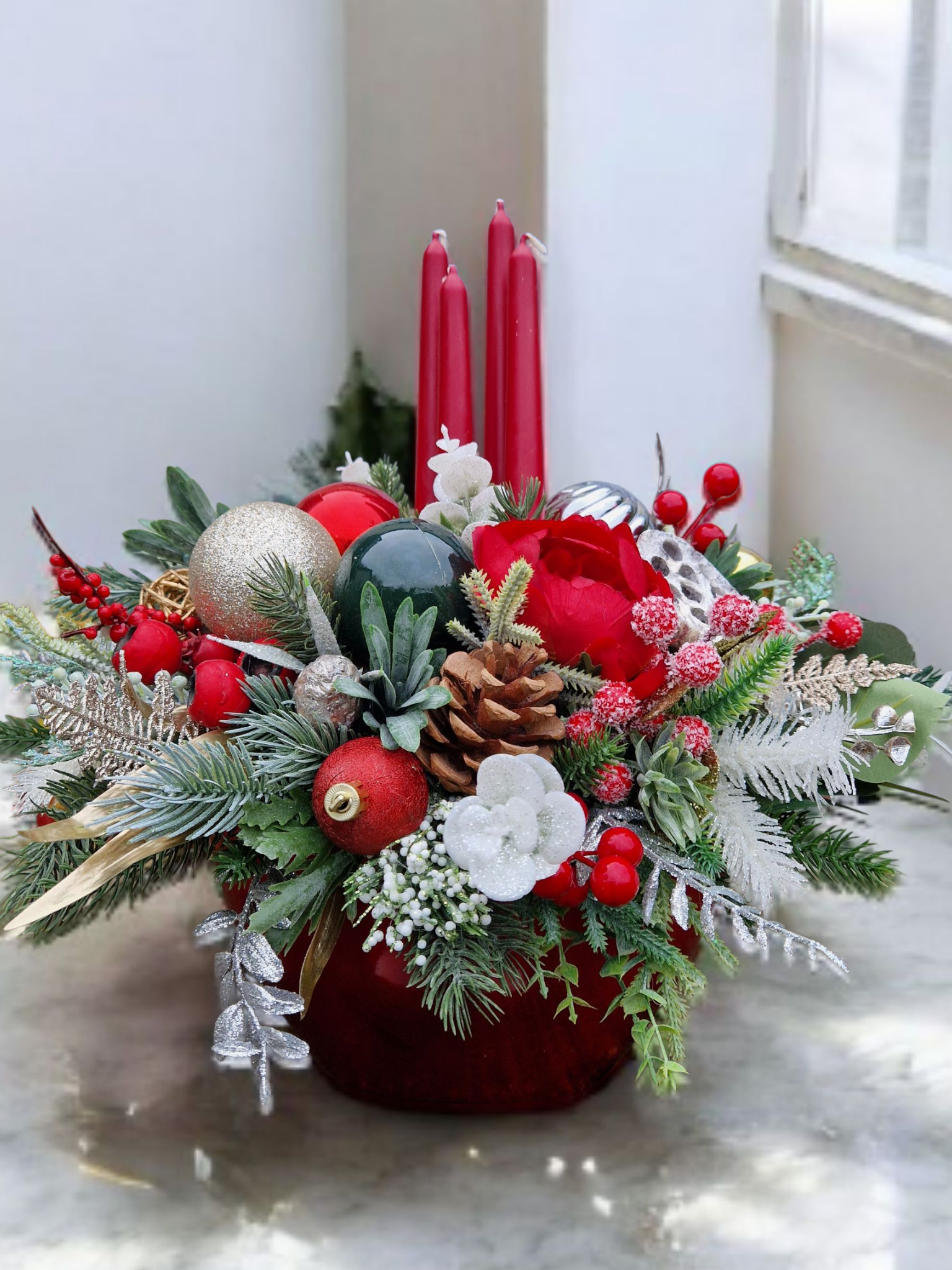 This festive arrangement is made of artificial flowers and artificial greenery in Christmas traditional colours.