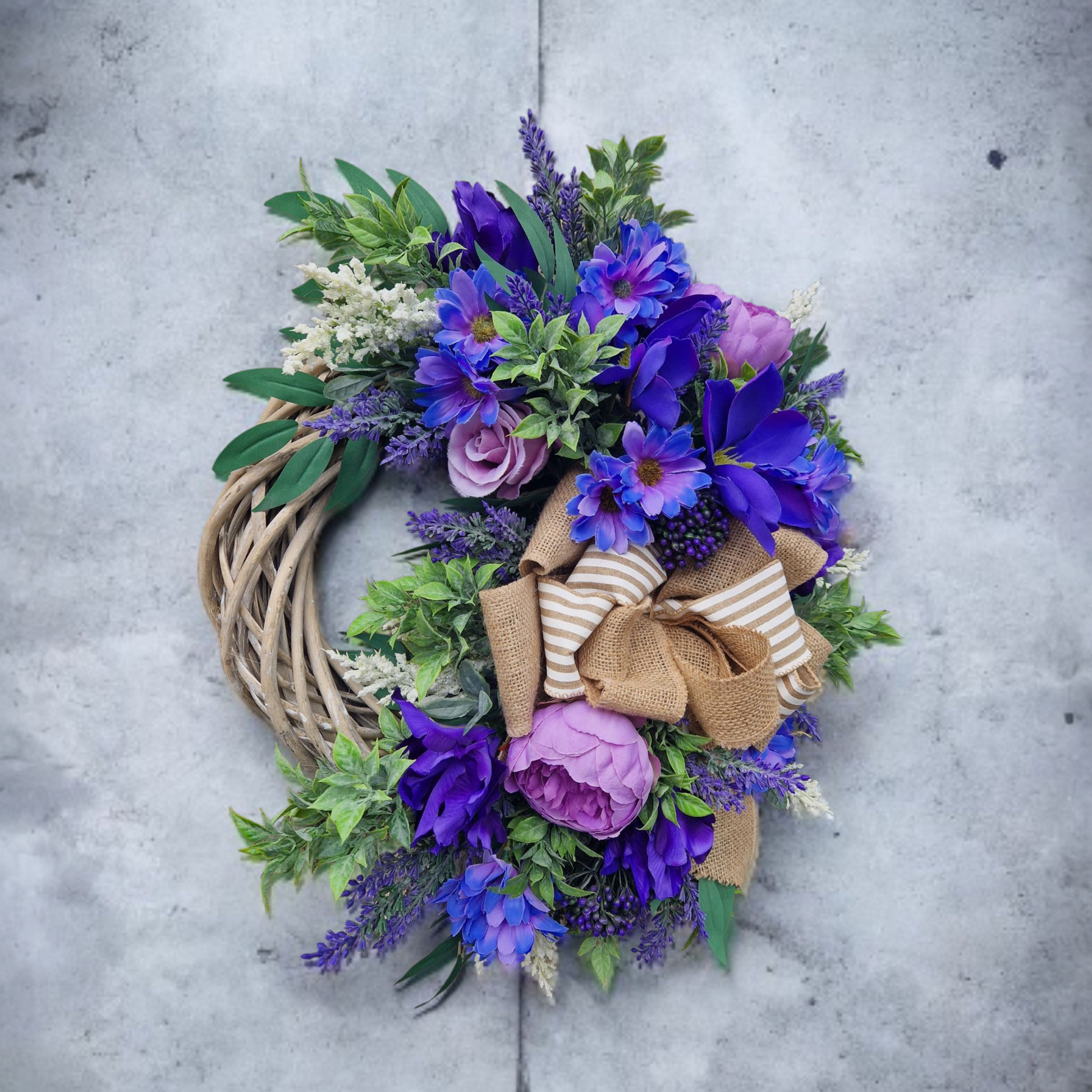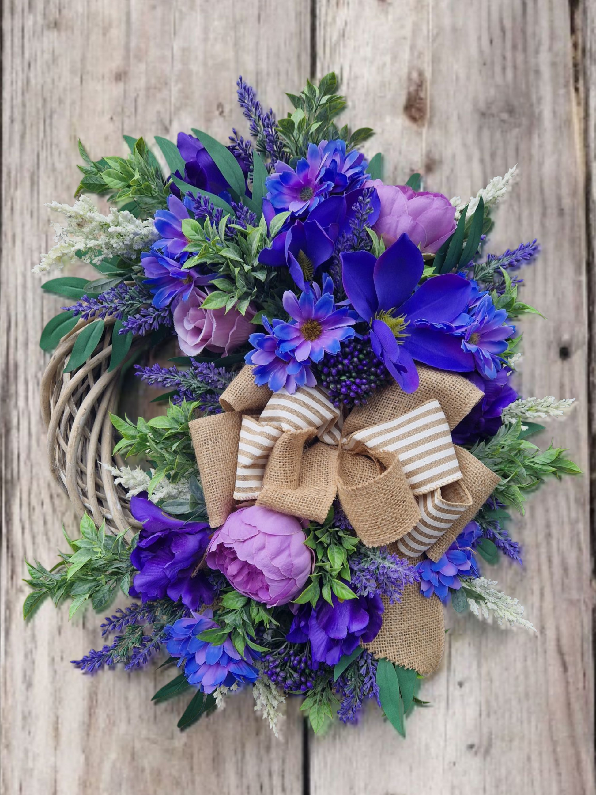 Floral door wreath in bright violet colors.